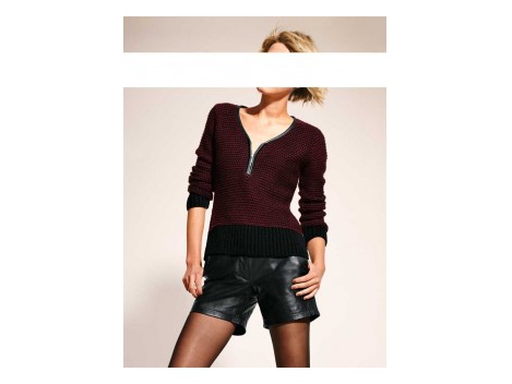 Designstarke Kreation mit luxuriösem Anspruch. Außen: lang geschnittener Pullover in Ecru und Schwarz, mit tiefem V-Ausschnitt, kleinen Aussparungen zwischen Sc...