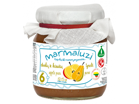 "MARMALUZI" Obuolių ir kriaušių tyrelė, kūdikiams nuo 6 mėn, grynasis kiekis 125g LIETUVIŠKA KOKYBĖ!!! Tyrelė paruošta iš Lietuvoje užaugintų saldžiųjų obuolių ir sultingųjų kriaušių. Ypatingai švelnaus skonio, natūraliai saldžią tyrelę rekomenduojame duoti po pagrindinių maitinimų. Tyrelė rekomenduojama ir alergiškiems vaikams. Be cukraus, glitimo, laktozės.Sudedamosios dalys: trinti obuoliai 80%, trintos kriaušės 20%, vitaminas C (L - askorbo rūgštis).Maistingumo deklaracija 100g:Energinė ir maistinė vertė 100 g: 277 kJ/66 kcal, riebalai 0,4g, iš kurių: sočiųjų riebalų rūgščių 0,05g, angliavandeniai 14,2g, iš kurių: cukrų 7,6g, krakmolo 0g, skaidulinės medžiagos 2,0g, baltymai 0,3g druska 0,003g, vitaminas C 25 mg; 71%**.*Druskos kiekį nulemia tik natūraliai joje esantis natris.**RMV (referencinė maistinė vertė);Grynasis kiekis: 125 g.