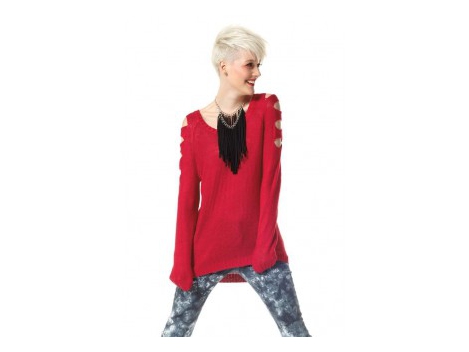 Unerhört modische Kreation mit angesagten Lochstrickvariationen und eingestrickten, goldglänzenden Pailletten, die bei jeder Bewegung für aufregende Glitzermome...