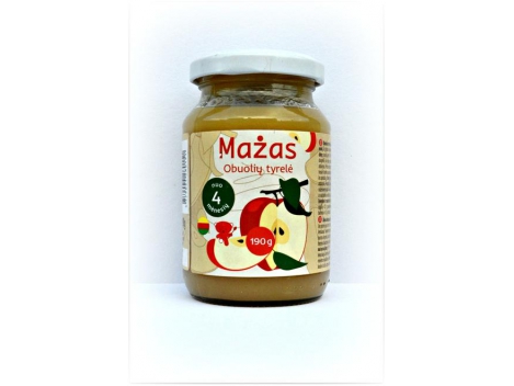 "MAŽAS" obuolių tyrelė kūdikiams nuo 4 mėn, neto masė 190g Specialios mitybinės paskirties maisto produktas kūdikiams nuo 4 mėnesių. Be glitimo ir krakmolo. Nepridėta cukraus. Produkto sudėtyje yra natūralių cukrų. Sudedamosios dalys: obuolių tyrė 100 %. Energinė ir maistinė 100 g produkto vertė: 251 kJ / 59 kcal; riebalai < 0,5 g, iš kurių: sočiųjų riebalų rūgščių < 0,1 g; angliavandeniai 13 g, iš kurių: cukrų 8,5 g, krakmolo 0 g; skaidulinės medžiagos 1,5 g; baltymai < 0,5 g; druska 0 g.Maistingumo vertė gali nežymiai keistis dėl maistinių medžiagų kiekio svyravimo natūraliose žaliavose. Paruošimo būdas: tyrelė jau paruošta valgyti. Neatidaryto tyrelės indelio dangtelis yra įdubęs, vakuumuota. Atsukant pasigirdęs spragtelėjimas garantuoja, kad indelis nebuvo atidarytas. Prieš vartojimą tyrelę išmaišykite ir įsidėję reikiamą kiekį maitinkite iš dubenėlio. Jei maitinate tiesiai iš indelio, naudokite plastikinį šaukštelį.Laikymo sąlygos: +5ºC – +25ºC. Venkite tiesioginių saulės spindulių. Pradėtą tyrelę laikykite dangteliu užsuktame indelyje šaldytuve, suvartokite per 24 val. nuo atidarymo. Produktą laikykite ir vartokite tiksliai pagal aukščiau pateiktus nurodymus.Svarbu! Skirta ne mažesniems kaip 4 mėn. kūdikiams, nebent nepriklausomi asmenys, turintys gydytojo, mitybos specialisto ar vaistininko kvalifikaciją, arba kiti už motinos ir kūdikio priežiūrą atsakingi darbuotojai patartų kitaip.Grynasis kiekis: 190 g