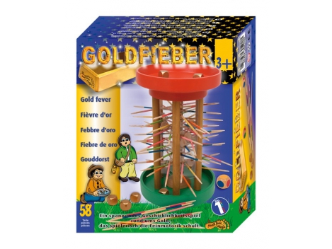 MEDINIS stalo žaidimas Aukso karštligė, Small foot, vaikams nuo 4 m. (6124) Stalo žaidimas visai šeimai. Dalyvių skaičius nuo 2 iki 6. Žaidimo eiga: pirmiausia reikia visus medinius pagaliukus susmaigstyti į bokštą, galima ir tiesiai ir įstrižai. Kai tai atlikta, įmetame auksinės spalvos kauliukus, kurie užstrigs ant pagaliukų. Jauniausias žaidėjas gali pradėti. Metamas kauliukas, pagal išmestą spalvą, žaidėjas turi ištraukti po vieną lazdelę per ėjimą. Žaidimas žaidžiamas pagal laikrodžio rodyklę.Jeigu nebėra tos spalvos lazdelės, žaidėjas praleidžia ėjimą. Žaidimo tikslas: surinkti kuo daugiau medinių pagaliukų ir padaryti taip, jog traukiant nenukristų aukso gabaliukai į bokšto apačią. Už kiekvieną ištrauktą pagaliuką yra skiriamas vienas taškas. Jei traukiant nukrenta aukso gabaliukas tam žaidėjui yra skiriamas baudos taškas. Žaidimas baigiasi, kai visi mediniai pagaliukai ištraukiami iš bokšto.Laimėtoju tampa žaidėjas, kuris surenka daugiausia taškų. Žaidėjas surinkęs mažiausiai taškų gali pradėti sekantį žaidimą pirmas.