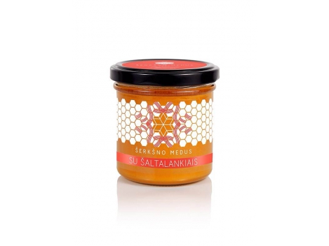 MEDUS SU ŠALTALANKIU, 200g Šaltalankių uogos turi daugiausiai vitaminų - C, PP, B, E, F, A, P, folio rūgšties, gliukozės, Fe, Mn. Todėl gerina regėjimą, stabdo aterosklerozės vystymąsi, mažina cholesterolio kiekį kraujyje, gerina žarnyno veiklą. Tiaminas po didelių fizinių ar emocinių krūvių atnaujina nervų sistemą. Oleino rūgštis plečia širdies, smegenų kraujagysles, intensyvina kraujo apytaką, mažina kraujo spaudimą. Serotoninas stiprina organizmo priešinimąsi infekcijoms, spartina kraujo krešėjimą.