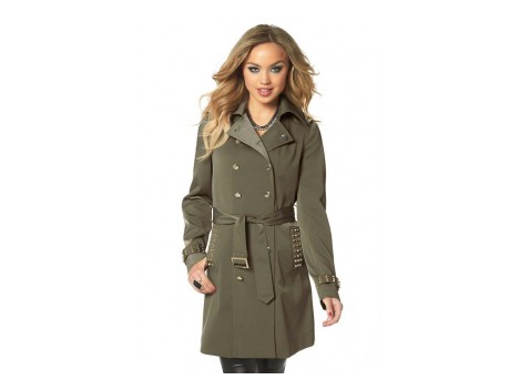 Unglaublich raffiniertes Trenchcoat mit Nietenbesatz auf den Eingrifftaschen, Schulterriegeln und den Ärmelriegeln. Goldglänzende Metall-Details. Eleganter Doppelreiher. Figurbetonende Form, die bis über das Gesäß reicht. Breiter, variabel tragbarer Reverskragen. Abnehmbarer Bindegürtel mit eckiger Schließe. Gehschlitz. Länge in Gr. 38 ca. 92 cm. Leicht glänzende, äußerst hochwertige, robuste Webqualität aus 87% Polyester/11% Viskose/2% Elasthan. Toniges Futter aus 100% Polyester.