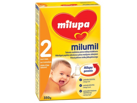 "MILUPA Milumil 2" pradinio maitinimo pieno mišnys kūdikiams nuo 6mėn, grynasis kiekis 350 gJūsų mažyliams! "Milumil 2" - tolesnio maitinimo pieno mišinys specialiai skirtas vartoti tik vyresniems kaip 6 mėn. amžiaus kūdikiams, jei jie nemaitinami motinos pienu. Mišinio sudėtis papildyta galaktooligosacharidais (GOS) ir fruktooligosacharidais (FOS) (0,8g/100ml), omega 6 ir 3 riebalų rūgštimis. Mišinys vartojamas kaip mišrios mitybos dalis kartu su gydytojo rekomentuotais papildomais produktais. Nuo 10 mėn." Milumil 2" galite pakeisti tolesnio maitinimo mišiniu "Milumil 3". Be glitimo. Sudėtis: laktozė (iš pieno), lieso pieno milteliai, augaliniai aliejai, maistinės skaidulos (galaktooligosacharidai iš pieno, polifruktozė), kalcio karbonatas, kalio chloridas, L-askorbo rūgštis, cholino chloridas, sojų lecitinas, taurinas, natrio L-askorbatas, geležies sulfatas, L-triptofanas, inozitolis, DL - alfa tokoferolacetatas, L-izoleucinas, nukleitidai (uridin-5-monofosfatas, citidin-5-monofasfatas, adenozin-5-monofosfatas, inozin-5-monofosfatas, guanozin-5-monofosfatas), cinko sulfatas, nikotinamidas, L-karnitinas, kalcio D-pantotenatas, pteroilmonogliutamino r., vario sulfatas, retinilo palmitatas, DL-alfa-tokoferolis, D-biotinas, tiamino hidrochloridas, cholekalciferolis, cianokolbalminas, piridoksino hidrochloridas, mango sulfatas, kalio jodidas, fitomenadionas, natrio selenitas.