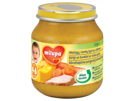 "MILUPA" moliūgų, vištienos ir morkų tyrelė, kūdikiams nuo 6 mėn, grynasis kiekis 125gPadėkite mažyliui atrasti naujus skonius!  Vartojimo būdas: reikiamą tyrės kiekį įdėkite į dubenėlį. Pašildykite šiltame vandenyje arba mikrobangų krosnelėje, po to kruopščiai išmaišykite. Prieš maitindami patikrinkite produkto temperatūrą. Tyrės užvirti nereikia. Likusią tyrę laikykite uždarytame indelyje šaldytuve. Atidarę suvartokite per 48 valandas.Sudėtis: moliūgai (22%), morkos (20%), grietinėlė (15%), bulvės (13%), vanduo (13%), vištiena (9%), kviečių krakmolas (be glitimo) (4%), svogūnai (2%), rapsų aliejus, kalendros, imbieras.Informacija apie alergenus: sudėtyje nėra glitimo, sojų, kiaušinių.