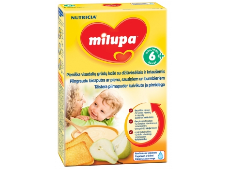 MILUPA pieniška kriaušių ir džiuvėsių košė kūdikiams nuo 6mėn, neto masė 250g