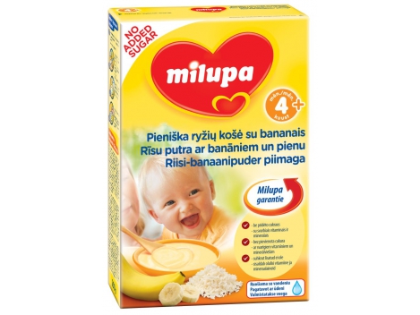 "MILUPA" pieniška ryžių košė su bananais kūdikiams nuo 4-6 mėn., 250 g Pieniška košė su bananais, skirta kūdikiams nuo 4 mėn. amžiaus. Be papildomo cukraus ir glitimo. Ši lengvai virškinama košė yra puikus angliavandenių, geležies, sočiųjų riebalų, kalcio ir vitamino D šaltinis. Pirmieji kiekvieno mažylio gyvenimo metai kupini įvairiausių atradimų. Reikia pajusti tiek daug naujų skonių! Šiuo gyvenimo laikotarpiu jam būtinas tinkamai suderintas maistas, aprūpinantis visomis augti reikalingomis maisto medžiagomis ir formuojantis sveikos mitybos įpročius.Sudėtis: Tolesnio maitinimo pieno (49,9%), demineralizuotas išrūgų milteliai, nugriebto pieno milteliai, augaliniai riebalai (yra sojos lecitinas), kalcio karbonatas, vitaminas mišinys (vitaminas C, niacinas, pantoteno rūgštis, vitaminas E, vitaminas B1, vitaminas B6, vitaminas , folio rūgštis, vitaminas K, vitaminas D, biotinas, vitaminas B12), geležies difosfatas, cinko sulfatas, vario sulfatas, kalio jodidas), kukurūzų miltai (ryžiai), bananų dribsniai (16,5%), nugriebto pieno milteliai, išrūgų milteliai demineralizuotas Maistinė vertė (100g)Kalorijos 404,00 kcalRiebalai 9,60gCukrus 42,70gBaltymai 12,00gAngliavandeniai 67,50g * Sudėtyje yra: pieno produktų, sojos