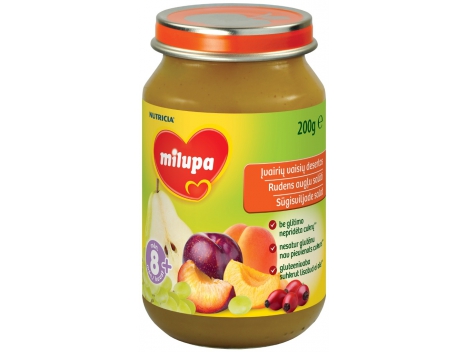 Pirmieji kiekvieno mažylio gyvenimo metai kupini įvairiausių atradimų. Reikia pajusti tiek daug naujų skonių! Šiuo gyvenimo laikotarpiu jam būtinas tinkamai suderintas maistas, aprūpinantis visomis augti reikalingomis maisto medžiagomis ir formuojantis sveikos mitybos įpročius. Milupa siūlo iš rinktinių produktų pagamintų patiekalų įvairovę! Spalvoti dangteliai padės lengviau išsirinkti ir paįvairinti vaikučio valgiaraštį. Kiekviename indelyje – skanus, suderintas maistas!Vaisiuose ir uogose gausu vitaminų, mineralų ir angliavandenių.Rudens vaisių salotos. Sudėtis: baltųjų vynuogių sultys, kriaušės, slyvos, abrikosai, tapijokų krakmolas, erškėtrožių vaisiai, vitaminas C. Informacija apie alergenus: be glitimo, be karvės pieno baltymų, ir laktozės, be sojos, be kiaušinių.