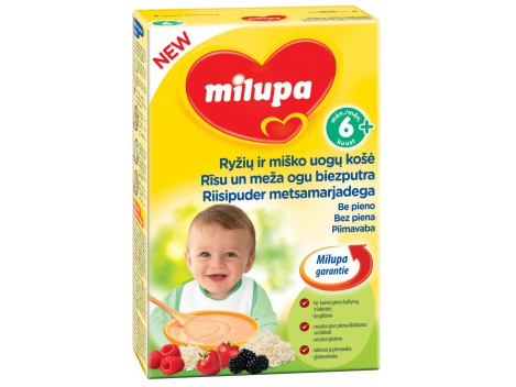 "MILUPA" ryžių – miško uogų košė be pieno, kūdikiams nuo 6 mėn, grynasis kiekis 200gAraskite įvairių skonių! Ryžių ir miško uogų košė be pieno. Kruopščiai atrinktų grūdų ir gardžių miško uogų košė suteiks Jūsų mažyliui energijos ir reikalingų maistinių medžiagų. Košę galima specialiai paruošti pagal kūdikio poreikius - be pieno arba su tolesnio maitinimo ar specialiu pieno mišiniu.- Be glitimo;- Be karvės pieno baltymų ir laktozės.Sudėtis: ryžių miltai 75,3%, cukrus, maltodekstrinas, miško uogų milteliai (gervuogių, aviečių, žemuogių) 1%, kalcio karbonatas, vitaminai (askorbo rūgštis, niacinas, D-α-tokoferolis, kalcio D-pantotenas, tiamino hidrochloridas, piridoksino hidrochloridas, retinolis, folio rūgštis, biotinas), geležies (III) difosfatas, cinko sulfatas, natūrali aviečių kvapioji medžiaga, natūrali braškių kvapioji medžiaga.