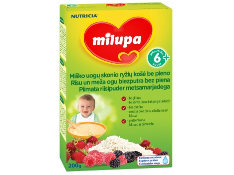 "MILUPA" ryžių – miško uogų košė be pieno, kūdikiams nuo 6 mėn, grynasis kiekis 200gAraskite įvairių skonių! Ryžių ir miško uogų košė be pieno. Kruopščiai atrinktų grūdų ir gardžių miško uogų košė suteiks Jūsų mažyliui energijos ir reikalingų maistinių medžiagų. Košę galima specialiai paruošti pagal kūdikio poreikius - be pieno arba su tolesnio maitinimo ar specialiu pieno mišiniu.- Be glitimo;- Be karvės pieno baltymų ir laktozės.Sudėtis: ryžių miltai 75,3%, cukrus, maltodekstrinas, miško uogų milteliai (gervuogių, aviečių, žemuogių) 1%, kalcio karbonatas, vitaminai (askorbo rūgštis, niacinas, D-α-tokoferolis, kalcio D-pantotenas, tiamino hidrochloridas, piridoksino hidrochloridas, retinolis, folio rūgštis, biotinas), geležies (III) difosfatas, cinko sulfatas, natūrali aviečių kvapioji medžiaga, natūrali braškių kvapioji medžiaga.