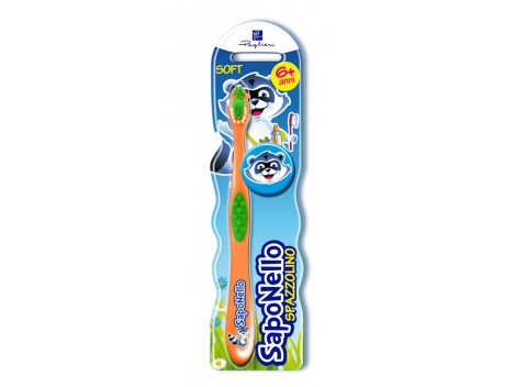 MINKŠTAS dantų šepetėlis SU HIGIENINIU DANGTELIU pieniniams ir nuolatiniams dantukams nuo 6 metų Saponello, 1 vnt. Paglieri muilo fabrikas Italijoje jau 130 metų gamina higienos prekes. Saponello vaikų burnos linija rūpinasi vaikų dantukais atsakingai, bet žaismingai. Atitinka visus pieninių ir nuolatinių vidutinio bei vyresnio amžiaus vaikų dantų priežiūros reikalavimus. Specialus minkštų spalvotų šerelių išdėstymas leidžia kokybiškai išvalyti tiek išorinę, tiek vidinę dantukų pusę. Suapvalinti šereliai kruopščiai valo dantų emalį. Pailginti ir nusmailinti švelnūs šereliai giliai prasiskverbia į tarpdančius ir masažuoja dantenas. Patogus dantų higienai nešiojant kabes. Neslystantis, vaikui patogus kotelis. Yra dviejų spalvų: oranžinis ir mėlynas.  Naudojimas: valyti dantukus 2-3 minutes du kartus per dieną (ryte ir vakare) arba pavalgius.Rekomenduojama keisti dantų šepetėlį kas 3 mėn.