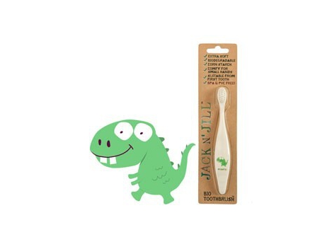 MINKŠTAS EKOLOGIŠKAS dantų šepetukas Jack N'Jill Dino, 1 vnt. Jack N‘ Jill dantukų šepetukas yra ergonomiškas, platesnė rankena puikiai tinka mažylio rankytei. Šį šepetėlį galima naudoti nuo pat pirmojo dantuko (nuo 6 mėn).Dantukų šepetėlio kotelis biologiškai suyrantis, kompostuojamas. Jūsų pasirinkimas yra teisingas - galite būti tikri, kad šie šepetėliai nebus žemės šiukšlės milijonus metų - skirtingai nuo daugelio kitų dantų šepetėlių, šis šepetėlis pagamintas iš 100% kukurūzų krakmolo, tad išmestas savaime suyra per 90 dienų Apvalūs, minkšti nailoniniai šereliai, švelniam, bet efektyviam dantukų valymui. Jokių pridedamųjų dalių ar papuošimų-mikrobai tikrai neras vietos kur pasislėpti.Perdirbama pakuotė. Be BPA ir PVC (Bisphenol A). Naudojimas: valykite dantukus sukamaisiais judesiais, stipriai nespaudžiant šepetėlio, du kartus dienoje. Kartu naudokite Jack n‘ Jill natūralią dantukų pastą-gelį. Šepetėlį keiskite kas 8 savaites arba anksčiau (ypač po vaikų ligų).Saugokime gamtą kartu su vaikais.