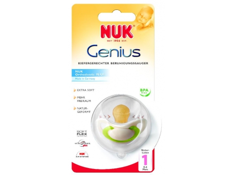 ''NUK'' lateksinis čiulptukas ,,Genius'' Nr.1(1vnt), nuo 0-6 mėn.(10725788) Čiulptukas „Genius „ – naujiena čiulptukų pasaulyje, genialus išradimas, ilgalaikių stebėjimų ir klinikinių tyrimų rezultatas. Be bisfenolio A. Pagamintas iš plono, minkšto, tačiau kartu ir tvirto, elastingo natūralaus latekso, be alergizuojančių baltyminių priemaišų, puiki vokiška kokybė. Atnaujintos ortodontinės formos („ortodontic PLUS“) kas svarbu lūpų, liežuvio ir žandikaulio raumenų formavimuisi. Čiulptuko viduje esančių specialių griovelių bei NUK oro sistemos dėka padidėja čiulptuko minkštumas, mažėja spaudimas žandikauliui ir dantims, atsiranda daugiau vietos liežuviui, kas svarbu kvėpavimui ir taisyklingam sąkandžiui.Skirtas nuraminimui, esant čiulpimo poreikiui. Svarbios pastabos: Esant individualiam jautrumui lateksui, jo baltyminės priemaišos retais atvejais gali sukelti vietinę alerginę reakciją. Čiulptuką rekomenduojama keisti kas 1-2 mėn., taip bus saugu ir higieniška. Pastebėjus įtrūkimus ar kitokius pažeidimus, būtina iš karto pakeisti nauju, kad vaikas neatkąstų ir nenurytų atplyšusių gabaliukų. Ilgai laikant tiesioginėje saulės šviesoje lateksas turi savybę tamsėti, tai nekeičia gaminio kokybės.