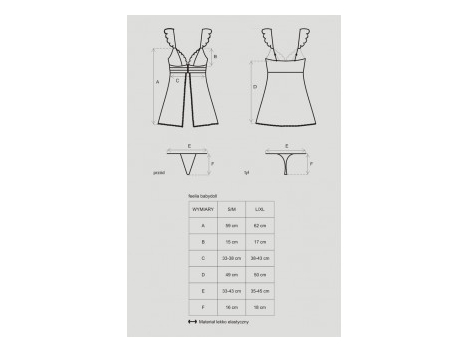 Producent odzieży: ObsessiveMarka odzieży: ObsessiveModel odzieży: Feelia babydollRodzajOferty: Oferta bieżącaNowość: NIEPłeć kupującego: KobietaSkładnik surowcowy: poliamid 94%, elastan 6%,Liczba haftek poziomych: 1Liczba haftek pionowych: 3Miejsce zapięcia: przódOdpinane ramiączka: NIERamiączka Regulowane: TAKOpisProducenta: Masz ochotę na trochę figlarności? BINGO! To właśnie na Ciebie czeka Feelia! Niewinna niczym aniołeczek, szybko pokażesz swoje grzeszne oblicze. Tylko nie staraj się tego opanować! Feelia zdecydowanie opanuje Ciebie! Po prostu daj się ponieść tym inspirującym emocjom!Niewinne szczegóły Feelia babydoll:- zwiewna koszulka uszyta z białej siateczki- miękkie miseczki zdobione koronką podkreślają biust- koronkowe rękawki dodają uroku- zapięcie między miseczkami – łatwo założyć, łatwo zdjąć!- regulowane ramiączka – idealne dopasowanie- przezroczysta siateczka podkreśla kobiece atuty- rozcięcie na brzuchu dodaje pikanterii- tył gładki, częściowo uszyty z satyny- brzegi materiału wykończone ozdobną tasiemką – perfekcyjne detale!- w komplecie pasujące do całości stringi- miękki i elastyczny materiałSkład: 94% poliamid, 6% elastan.