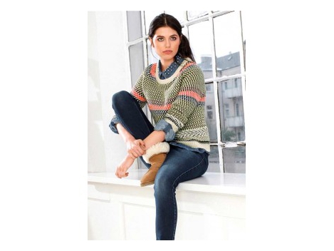 Strick-Chic gefährlich schön. Wirkungsvoller Pullover mit Allover-Ethnomuster. Kontrastfarbene Rippenbündchen am Rundhalsausschnitt, Ärmelsaum und Bund. Sehr fi...