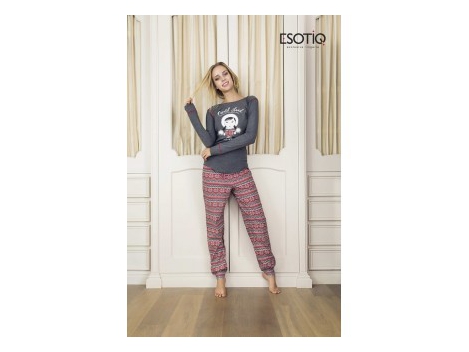Słodka, jasno szaro-koralowa piżamka z nadrukiem Eskimoski. Oto niezapomniana podróż do "Krainy Lodu". Bluzeczka posiada zgrabny, lekko dopasowany do ciała fason i długi rękaw. Dół wykończony półkoliście, wygląda bardzo zgrabnie. Spodnie wzorzyste, idealnie dopasowane do bluzeczki. Na gumce w pasie. Renomowany producent Esotiq. Skład: bluzeczka 95% bawełna, 5% elastan. Spodnie 100% bawełna.  RozmiarDługość bluzkiObwód w biuścieDługość spodniObwód w biodrachS63 cm80-86 cm96 cm88-100 cmM66 cm86-92 cm100 cm94-106 cmL69 cm92-98 cm104 cm100-112 cmXL71 cm98-104 cm108 cm106-118 cm