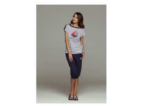Patogūs ir grakštus ladies pižamos prižiūrimi madinga, Jūrininkas modelio. Tamsiai mėlyna ir balta dryžuotas palaidinė trumpomis rankovėmis, nereikia apriboti judėjimą, puošia žavinga spausdinti valtis. Paryškina pečių linija yra tamsiai mėlyna vamzdynai. Ateina su 3/4 ilgio kelnės. Mėlyna, sklandžiai su gumine juosta ir raišteliu ties juosmeniu. Jie turi dvi kišenes neapdailintais kraštais su raudona vamzdynų. Visa telpa kartu gerai. Kontūre dydis Palaidinė biustas ilgis kelnių liemens apimtis S 66 80-86 71 88-100 M 68 86-92 73 94-106 ilgio ...
