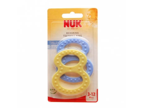 Plastiko žiedas-kramtukas 8, 3-12 mėnesių kūdikiams, NUK (10256227) Iš specialaus plastiko be bisfenolio A (BPA) ir be polivinilchlorido (PVC).Kramtukai skirti 3-12 mėn. amžiaus kūdikių nuraminimui, kramtymo įgūdžių lavinimui, intensyviai masažuojant dantenas, palengvina dantų prasikalimą.Kramtymas svarbus seilių išsiskyrimui, tai padeda išvengti dantų ėduonies. Šiuos "aštuoniukės" formos su kauburėliais NUK kramtukus mažyliui lengva laikyti, jais galima žaisti, tai stimuliuoja lietimo pojūčius, skatina vaiko lavinimą. Naudojimas: Prieš pirmą panaudojimą išplaukite šiltu vandeniu su muilu. tinka švelnus NUK buteliukų ploviklis.