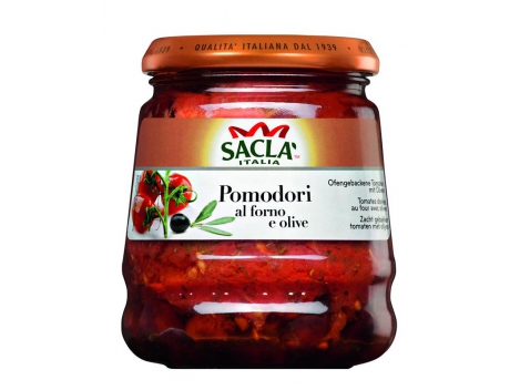Pomidorai kepti krosnyje aliejuje su alyvuogėmis SACLA, 285g Sacla – išskirtinio skonio ir aukščiausios kokybės italų Ercole šeimos gaminami padažai makaronams, pesto, bruchettina užtepėlės - tikras gurmanų atradimas. Nerealus Pesto, na atsisėdi ir tepi, tepi tepi, o sūrio krisleliai taip ridenasi liežuviu, išleisdami savo nepakartojamą aromatą... žiūri, o stiklainiuko jau kaip ir nebėra. Na o vynuoginiai pomidoriukai padaže besimaudantys ..., o kai jau atrodo viską žinai apie šį stebuklą, dugne dar randi nerealiai aliejaus prisotintas juodąsias alyvuoges. Na ir kodėl čia tik padažas, kodėl negalėtų tai vadintis tiesiog pomidoriniu desertu... Sudėtis: kepti pomidorai 53%, alyvuogės 6%, saulėgrąžų aliejus, juodosios alyvuogės be kauliukų, jūros druska, raudonėliai, česnakai, kvapiosios medžiagos, rūgštingumą reguliuojanti medžiaga citrinų rūgštis. Produkcija pasižymi išskirtinių skonių ir kokybę.Itališki slyviniai pomidorai, nulupti ir lėtai iškepti orkaitėje, marinuoti su aliejumi ir tradiciniais Viduržemio jūros sudedamosiomis dalimis. Tai unikalaus skonio delikatesas, kuris 2012 metais buvo pripažintas metų gaminiu Olandijoje, bei Belgijoje.