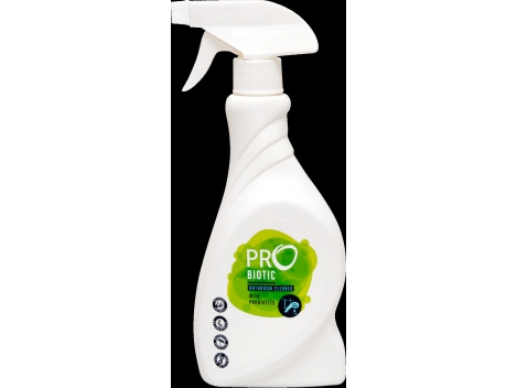 "ProBiotic" vonios kambario valiklis, neto turis 500 mlProbiotikų galia! Probiotikai – gyvi mikroorganizmai, kurie natūraliai yra randami tiek žmogaus ir gyvūnų organizmo viduje, tiek ir išorinėje mus supančioje aplinkoje. Probiotikai yra naudingos “draugiškomis” vadinamos bakterijos.Probiotinių produktų privalumai:- Efektyviai pašalina biologinės kilmės nešvarumus ;- Suteikia apsaugą nuo patogeninių bakterijų;- 100% biologiškai išsiskaidančios medžiagos;- Ypač tinka alergiškiems, jautriems, sergantiems astma žmonėms;- Saugu ne tik žmogui, bet ir naminiams gyvūnams;- Nekenkia ir tausoja valomus paviršius;- Iki 8 dienų apsauga nuo blogųjų bakterijų;- Pelėsio ir grybelių prevencija ir kontrolė;- Biologinės kilmės kvapų pašalinimas ir kontrolė.Probiotinis vonios kambario valiklis, pagamintas sujungiant natūralias valymo medžiagas su draugiškomis bakterijomis, sukuria aukščiausią švaros ir higienos standartą voniose, kriauklėse, dušuose ir skleidžia greipfrutų ir žaliųjų citrinų kvapą. Sukuria draugišką bakteriologinę aplinką.Panaikina dėmes, muilo nuosėdas ir vandens žymes.Plaunant įsisenėjusias dėmes, reikia užpurkšti ir palikti kelioms minutėms prieš nuvalant. Valymui naudokite silpnai drėgną kempinėlę ir pabaigoje nuvalykite sausu skudurėliu. Didesnes kalkių sankaupas valykite kelis kartus naudodami šiurkščią kempinės pusę. Didelės kalkių sankaupos pilnai nusivalys per keletą kartų.Sudėtis: tarp kitų ingredientų yra <5% nejoninės aktyviosios paviršiaus medžiagos, kvapai, bakterijų kolonijos.