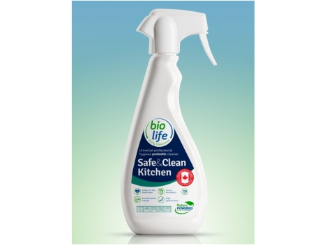 Probiotinis valiklis ir riebalų šalinimo priemonė visiems virtuvės paviršiams Biolife Safe&Clean Kitchen, 500 ml Probiotinis valiklis ir riebalų šalinimo priemonė visiems virtuvės paviršiams: - Stalviršiams - Viryklėms - Garų surinktuvams - Orkaitėms - Mikrobangų krosnelėms - Šaldytuvams - Kitai virtuvinei įrangai ir priedams Greitai ir giliai šalina riebalus nuo daugelio paviršių. Patvirtinta, kad priemonė gali būti naudojama šalinti riebalus nuo paviršių, kurie liečiasi su maistu.