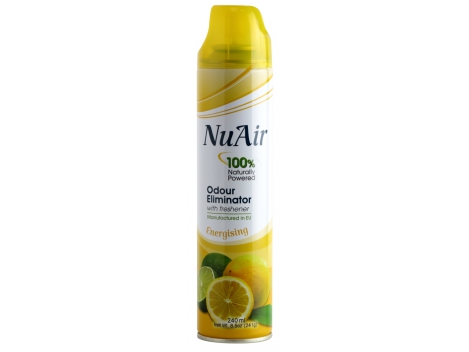 Purškiamas kvapų ir oro gaiviklis NU AIR Energis, 240ml Purškiamas kvapų naikiklis oro gaiviklis. Pašalina kvapus nemaskuodamas, suteikia gaivumo be dirbtinio kvapo įprastinių oro gaiviklių . Nurodymai: Didžiausias efektas pasiekiamas, purškiant gaiviklį iš kambario vidurio į visas puses. Produkto nepurtyti. Nepurkšti tiesiai ant maisto, audinių, baldų ar kilimų. Nu Air gaivikliai naudoja azotą vietoj propano-butano dujų. Kadangi mūsų kvepuojamo oro 78 proc. sudaro azotas, galima teigti, kad šie oro gaivikliai yra draugiški aplinkai