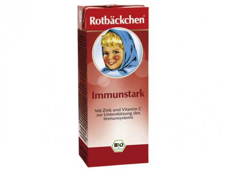 "RABENHORST" Ekologiškos sultys "Stiprus imunitetas", 200ml Sultys iš šviežių ekologiškų vaisių ir uogų be papildomo cukraus. Pagamintos ne iš koncentrato. Cinko šaltinis, turi daug vitamino C .„Stiprus imunitetas“ yra įvairių vaisių sultys, praturtintos cinko gliukonatu ir vitaminu C. Kadangi organizmas pats negamina cinko ir gali jo sukaupti tik ribotą kiekį, jo būtina gauti pakankamai su maistu.Vitaminas C svarbus normaliam kolageno formavimuisi ir normaliai kraujagyslių, kaulų, kremzlių, dantenų, dantų, odos funkcijai. Vitaminas C svarbus normaliai nervų ir imuninės sistemos veiklai; padeda mažinti nuovargį.Cinkas svarbus normaliai: DNR sintezei; pagrindinių maistinių medžiagų apykaitai, angliavandenių, vitamino A, riebalų rūgščių, rūgščių ir šarmų apykaitai; baltymų sintezei. Cinkas svarbus normaliam: vaisingumui ir reprodukcijai; pažinimo funkcijai; kaulų, plaukų, nagų ir odos būklei palaikyti, imuniteto funkcijai. Cinkas padeda palaikyti normalią testosterono koncentraciją kraujyje; išsaugoti normalų regėjimą. Cinkas padeda apsaugoti ląsteles nuo oksidacinio streso.Svarbu įvairi ir subalansuota mityba bei sveikas gyvenimo būdas.Sudėtis: raudonųjų vynuogių sultys*, obuolių sultys*, aronijų sultys*, šeivamedžio sultys*, acerolos vaisių minkštimas*, vitaminas C 0,1 g/100 ml, cinko gliukonatas 10,45 mg/100 ml.* ekologiški90 ml = 1 DV (duonos vienetai - angliavandenių matas, svarbus sergantiems diabetu).Maistinė vertė (100 ml):- energetinė vertė 235 kJ (56 kcal),- baltymų 0.2 g,- angliavandenių 13.4 g,iš jų cukrų (vaisių) 13.0 g,- riebalų 0.1 g,iš jų sočiųjų riebiųjų rūgščių < 0.05 g,- skaidulinių medžiagų 0.1 g,- natrio < 0.01 g,- cinko 1.5 mg / 15% RPN,- vitamino C 80 mg / 100% RPNRPN - rekomenduojama paros norma (suaugusiems)100 ml šių sulčių per dieną patenkina vidutinį cinko ir vitamino C dienos poreikį:Cinkas Vitaminas CVaikai (1-3 metų) 50% 113%Vaikai (1-3 metų) 30% 114%Vaikai (7-9 metų) 21% 100%Mergaitės (10-12 metų) 21% 89%Berniukai (10-12 metų) 17% 89%Mergaitės (13-14 metų) 16% 80%Berniukai (13-14 metų) 16% 80%Nėščiosios 15% 73%Maitinančios motinos 14% 53%