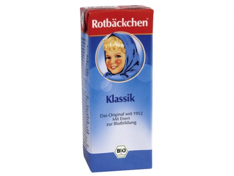 "RABENHORST" Sulčių kokteilis vaikams "Raudoni skruostukai", 200ml Sultys iš šviežių ekologiškų vaisių ir uogų, sumaišytos pagal slaptą „magišką receptą“. Geležies ir vitamino C šaltinis.„Raudoni skruostukai“ rūpinasi viso vaiko organizmo stiprinimu bei padeda mokantis, sportuojant ir žaidžiant.Geležis svarbi normaliai pažinimo funkcijai, energinių medžiagų apykaitai, raudonųjų kraujo kūnelių kraujodarai ir hemoglobino susidarymui, deguonies pernešimui organizme; normaliai imuninės sistemos veiklai. Geležis padeda mažinti nuovargį.Vitaminas C svarbus normaliam kolageno formavimuisi ir normaliai kraujagyslių, kaulų, kremzlių, dantenų, dantų, odos funkcijai. Vitaminas C svarbus normaliai nervų ir imuninės sistemos veiklai; padeda mažinti nuovargį.Svarbu įvairi ir subalansuota mityba bei sveikas gyvenimo būdas.Sultyse „Raudoni žandukai“ naudojamas geležies(II) gliukonatas yra gaminamas iš vynuogių cukraus. Gliukonatas jungiamas su dvivalente geležim, kuri gaunama iš neorganinių geležies druskų. Organizmas ypač gerai pasisavina geležį geležies(II) gliukonato forma. Geležies(II) gliukonate nėra gyvulinės kilmės sudėtinių dalių. Todėl „Raudoni skruostukai“ tinka ir vegetarams.Sudėtis: raudonųjų vynuogių*, obuolių*, žaliųjų vynuogių*, apelsinų* sultys, acerolos vaisių* minkštimas, gervuogių*, vyšnių* sultys, medus (1%), geležies (II) gliukonato (iš augalų) 28 mg/100 ml.*ekologiškas.Maistinė vertė (100 ml) 260 kJ/62 kcal: baltymų 0.2 g, angliavandenių 15.0 g (iš jų cukrų 14.9 g), riebalų <0.1 g, skaidulinių medžiagų 0.1 g, natrio <0.01 g, vitamino C 20 mg (20% RPN), geležies 3.2 g (25% RPN).80 ml = 1 DV (duonos vienetai - angliavandenių matas, svarbus sergantiems diabetu).100 ml sulčių sudaro tokią dalį (%) rekomenduojamos paros normos:Geležies Vitamino CVaikai (1 – 3 m.) 44% 33%Vaikai (4 – 6 m.) 44% 29%Vaikai (7 – 9 m.) 35% 25%Mergaitės (10 – 12 m.) 23% 22%Berniukai (10 – 12 m.) 29% 22%Mergaitės (13 – 14 m.) 23% 20%Berniukai (13 – 14 m.) 29% 20%Nėščiosios 12% 18%Maitinančios moterys 18% 13%Prieš naudojimą suplakti. Suaugusiems ir vaikams nuo 1 metų, neskirta kūdikiams.