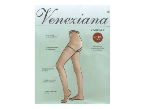 Atpalaiduojantis Veneziana triko, pagal gamintoją, su priespaudos vidurkį. Lankstus, skirta prižiūrėti jūsų komfortui ir sveikatai. Palengvinti tinkamą cirkuliaciją. Išvengti nuovargio ir kojų patinimas. Mažas, medvilnės įsiuvu. Storis 40 DEN. Sudėtis: 77% Nailonas, 21% lycra, 2% medvilnė. Veneziana yra sudėtingas stilius, dizainas ir kokybė aukščiausio lygio.