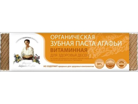 "RBA VITAMINAJA“ organinė dantų pasta su vitaminais, dantenų apsaugai, 75 ml Recepty Babuški Agafji dantų pastą su vitaminais rekomenduojama naudoti esant dantenų kraujavimui. Dantų pasta stabdo parodontozėsvystymąsi. Be to ji švelniai poliruoja dantų emalį, suteikdama jam žvilgesį ir natūralų baltumą. Gamtiniai smulkiagrūdžiai abrazyviniai komponentai padeda efektyviai ir kruopščiai pašalinti dantų apnašas. Produkto formulė savo sudėtyje neturi kenksmingų sveikatai cheminių komponentų:be SLS (SLES)be ftalatųbe parabenųbe florobe formaldehidobe sunkiųjų metalųbe gliutenobe cukrausbe komponentų, sudėtyje turinčių aliuminio be chlorheksidinobe mineralinių aliejųNėra gyvulinės kilmės komponentųNėra genomodifikuotų komponentųNėra naftos perdirbimo komponentų