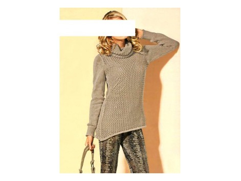 Noblesse išsamiai. Aukšta apykaklė, moteriškus raukiniai ir dekoratyvieji detalės suteikia šiam megzti projektuotojui sumodeliuoti individualų liesti! 3/4 ir ra...