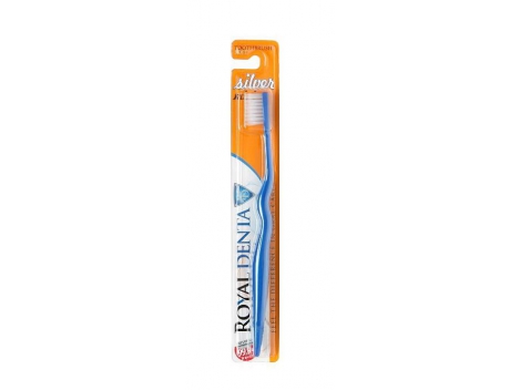 "ROYAL DENTA Silver Mini" dantų šepetėlis su sidabru, vaikams nuo 6metų Karališka dantų priežiūra! Minkštas dantų šepetėlis su sidabro nanodalelėmis. Skirtas vaikams nuo 6 m. ir nešiojantiems dantų kabes.Kuo unikalūs „Silver“ ir „Gold“ šepetėliai?- Puikios antibakterinės savybės. Klinikiniais tyrimais įrodyta, jog šie šepetėliai sunaikina iki 99,9 % visų bakterijų, „susitinkančių“ su šepetėlio šereliais;- Dvejopa šerelių technologija. Viršutiniai ploni ir švelnūs nusmailinti šereliai giliai prasiskverbia į sunkiai įprastais dantų šepetėliais pasiekiamas tarpdančių vietas. Apatiniai suapvalinti šereliai puikiai valo dantų emalį ir jo nepažeidžia;- Dantų valymas šiais šepetėliais gerina kraujo apytaką, masažuoja dantenas, stiprina burnos ertmės atsparumą infekcijoms, palaiko ilgalaikį švaros ir gaivos pojūtį;- Ergonomiškas ir neslidus kotelis pagamintas iš natūralios gumos užtikrina judesių kontrolę valant dantis.Kas yra nano dalelė?Šepetėlio šereliuose esančios sidabro ir aukso nanodalelės yra 5-50 nm (10-9 metro) dydžio. Itin didelis nanodalelių tūrio ir paviršiaus ploto santykis lemia ypatingą nanodalelių aktyvumą, todėl šis unikalus šepetėlis padeda efektyviau nuvalyti net ir sunkiausiai įveikiamas apnašas.Valant dantis paprastu šepetėliu, ant jo šerelių kaupiasi milijonai bakterijų, kurios ardo danties emalį, sukelia dantenų uždegimą. Naudojant šepetėlį su nanodalelėmis, praėjus 2 - 4 val. po dantų valymo, aptinkama iki 99,9 % mažiau bakterijų ant šepetėlio šerelių. Taip pat nanodalelės užpildo mikroskopinius dantų įtrūkimus, švelniai poliruoja danties paviršių, kuris tampa slidus ir nepatogus bakterijoms. Dėl šios priežasties bakterijos nesugeba prisitvirtinti prie dantų, kurie ilgai išlieka švarūs ir blizga.