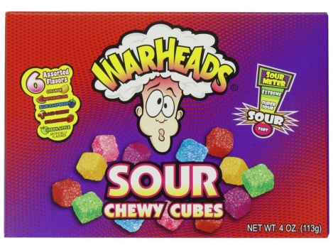 RŪGŠČTŪS KUBELIAI WARHEADS, 113g Sudedamosios dalys: cukrus, kukurūzų sirupas, kukurūzų krakmolas, modifikuotas kukurūzų krakmolas, citrinos rūgštis, vyno rūgštis, raudona 40, geltona 5, geltona 6, mėlyna 1, dirbtiniai dažikliai, natūralūs ir dirbtiniai skoniai, fumaro rūgštis, natrio citratas.Sudėtyje gali būti: pieno, sojos, žemės riešutų ir kviečių..Maistinė vertė 100g: energinė vertė 140kcal, riebalų 0g, iš kurių riebalų rūgščių 0g, anglavandenių 34g, iš kurių cukraus 25g, baltymų 0g, natrio 0mg.