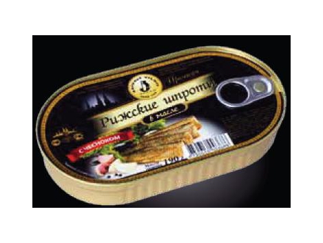 "RYGOS" šprotai aliejuje su krapais, 190g Sudėtis: rūkyta žuvis(70%), augalinis aliejus(29%),valgomoji druska, krapai.