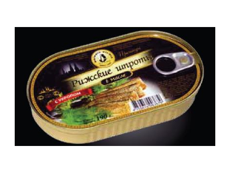 "RYGOS" šprotai aliejuje su prieskoniais, 190g Sudėtis: rūkyta žuvis(70%), augalinis aliejus(29%),valgomoji druska, prieskoniai.