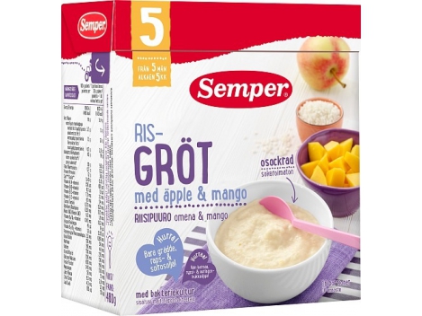 RYŽIŲ košė su OBUOLIAIS, MANGAIS ir PROBIOTIKAIS, kūdikiams nuo 5 mėn., Semper, 480 gŠi švelni, tyrelės konsistencijos košė puikiai tinka pusryčiams, priešpiečiams arba vakarienei. Pagaminta iš ryžių miltų, pagardinta obuoliais ir mangais.Patogi ir sandari pakuotė: paprasta daug kartų atidaryti-uždaryti, pasemti-pilti miltelius, saugu laikyti. Be pridėto cukraus. Praturtinta geležimi, vitaminais, probiotikais. Be glitimo.Svarbu: Produktas tinkamas vartoti nuo 5 mėn. amžiaus, nebent nepriklausomi asmenys, turintys mediko, mitybos specialisto ar farmacininko kvalifikaciją, arba kiti už motinos ir kūdikio priežiūrą atsakingi darbuotojai patartų kitaip. Skirta ne mažesniems nei 4 mėn. kūdikiams.Sudėtis: nugriebto pieno milteliai, ryžių miltai, demineralizuoti išrūgų milteliai, obuolių sulčių koncentratas (13%), grietinėlė (9%), rapsų aliejus (7%), saulėgrąžų aliejus (7%), mangų dribsniai (1,5%) (mangai, kukurūzų krakmolas, saulėgrąžų lecitinas), mineralinės medžiagos (kalcis, geležis, cinkas, jodas), ), vitaminai (A, D, E, C, tiaminas (B1), niacinas (vit.PP), B6, folio rūgštis, B12, pantoteno rūgštis), probiotinės bakterijos (Lactobacillus casei F19). Sudėtyje yra pieno.Dozavimas: iš 30 g miltelių ir 100 ml geriamo vandens gauname apie 130 g paruoštos košės.Dėmesio! Netinkamas produkto paruošimas gali pakenkti Jūsų kūdikio sveikatai, todėl atidžiai perskaitykite ir tiksliai vadovaukitės instrukcijos nuorodomis. Miltelius ir geriamą vandenį visada vartokite teisingais kiekiais.Paruošimas: į gilią lėkštę įpilkite 100ml, 50C temperatūros geriamo vandens. Maišydami suberkite 3,5 valgomuosius šaukštus košės miltelių. Gerai išmaišykite iki košės konsistencijos. Prieš maitinimą įsitikinkite, kad maistas ne per karštas. Nelaikykite košės likučių.