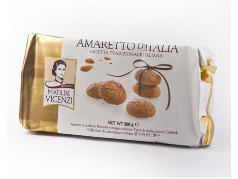 Matilde Vicenzi skanėstai iš Italijos – maži, elegantiški sausainiukai su migdolais, kepami nuo 1905 metų Toskanos kepyklose iš vietinių ūkininkų gaminamo šviežio sviesto, Italijos saulėje sunokusių javų miltų ir prie jūros užaugintų migdolų. Geriausios Italijos konditerijos tradicija ir kokybė – išskirtinai Assorti.lt. Sausainiai MATILDE VICENZI Amaretto D'italia, 200g Sudėtis: cukrus, migdolai 20%, kiaušinių baltymai, pieno cukrus ir baltymai, tešlos kildymo medžiaga (natrio vandenilio karbonatas), natūralios kvapiosios medžiagos.Sudėtyje yra kiaušinių ir pieno produktų.Maistinė vertė 100 g:energinė vertė: 1828kj/433kcal, baltymų 6,90g, angliavandenių 77,00g, iš kurių cukrų 76,00g, riebalų 10,20g, iš kurių sočiųjų r.r 1,00g, skaidulinių medžiagų 3,00g, druskos 0,05g.