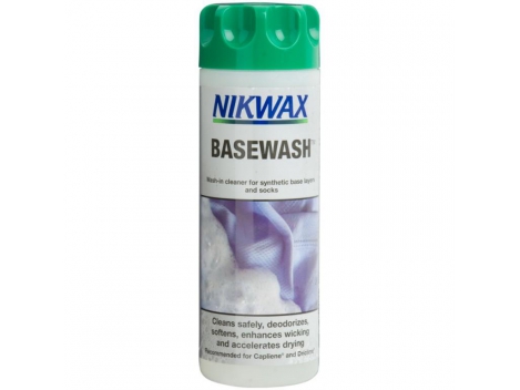Skalbiklis sintetiniams apatiniams Nikwax Base Wash 300ml Sintetinių apatinių drabužių skalbiklis. BaseWash švelniai išplauna ir atnaujina kapiliarumo savybes, kurių dėka sintetiniai apatiniai drabužiai efektyviai sugeria ir išgarina prakaitą.BaseWash gaivina ir minkština, pašalina nemalonius kvapus.  Rekomenduojama Lifa, Dryflo ir visiems Parameta audiniams.   Prieš skalbimą nedideliu kiekiu BaseWash pavalykite labiau užterštas vietas. Nuimkite visas neskalbiamas dalis. Gerai suplakite prieš naudojimą. Laikykitės priežiūros etiketėje pateiktų nurodymų. Nenaudokite skalbinių minkštiklio. Šia priemone neskalbkite neperšlampamų drabužių.   Skalbimas skalbyklėje: - Įdėkite drabužius į skalbyklę. -  Įpilkite 1 pilną dangtelį* BaseWash (50ml)-  Skalbkite laikydamiesi priežiūros etiketėje pateiktų nurodymų.  Skalbimas rankomis (mūvėkite pirštines):  -  Pamerkite drabužius į šiltą vandenį. -  Įpilkite pusę dangtelio* BaseWash (25ml)-  Išskalaukite 3 kartus švariame vandenyje.   Džiovinimas:  Džiovinkite natūraliai arba žemoje temperatūroje džiovyklėje, jeigu tai numatyta priežiūros etiketėje.   *Panaudoję dangtelį išplaukite.