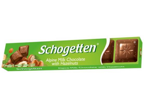 ŠOKOLADAS SU SMULKINTAIS LAZDYNŲ RIEŠUTAIS Schogetten, 33gSudedamosios dalys: cukrus, kakavos sviestas, grietinėlės milteliai, lazdynų riešutai (10%), kakavos masė, nenugriebto pieno milteliai, sviesto riebalai, emulsiklis (sojų lecitinas), kvapioji medžiaga vanilė.Sudėtyje gali būti: žemės riešutų, kitų riešutų, glitimo ir kiaušinių pėdsakų.Maistinė vertė 100g: energinė vertė 2392kJ/574kcal, riebalų 38g, iš kurių riebalų rūgščių 20g, angliavandenių 51g, iš kurių cukraus 50g, baltymų 5,9g, druskos 0,13g.