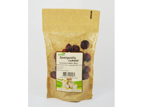 DŽIOVINTOS SPANGUOLĖS Kluth, 125g Sudedamosios dalys: spanguolės 61%, cukrus 38,5%, saulėgrąžų aliejus.Maistinė vertė 100g: energinė vertė 1405kJ/331kcal, rieba...