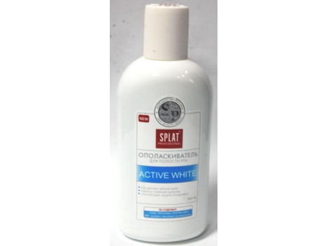 "SPLAT PROFESSIONAL Active White" burnos skalavimo skystis, 340mlGražiausiai šypsenai! Sudėtyje nėra fluorido, alkoholio, triklosano, chlorheksidino.Šis skalavimo skystis ideliai tinka kavos, arbatos mėgėjams, rūkantiems.Sudėtyje esantys papajos enzimai apsaugo dantis nuo apnašų ir palaiko gaivų kvėpavimą.Vaikams iki 6 m. naudokite nedidelį kiekį, stebėkite, kad nenurytų. Jeigu vartojami produktai, kurių sudėtyje yra fluorido, pasitarkite su odontologu arba savo gydytoju. Naudojimas: Skalaukite burną po kiekvieno valgio ar dantų valymo. Įpilkite šio skysčio į kamštelį, neskieskite. Skalauti burną apie 1 minutę, išspjauti. Nenuryti.