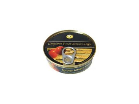 Šprotai pomidorų padaže, 160g Sudėtis: rūkyti šprotai (65%), pomidorų padažas (35%)( vanduo, pomidorų pasta, augalinis aliejus, cukrus, druska, džiovintas svo...