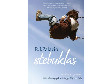 Štai ką aš manau: vienintelė priežastis, dėl kurios nesu normalus, yra tai, kad niekas manęs nelaiko normaliu.Manau, vienintelis žmogus pasaulyje, kuris supranta, kad esu toks kaip visi, – aš pats.Beje, aš vardu Ogastas. Nepasakosiu, kaip atrodau. Kad ir ką manytumėt, tikriausiai yra daug baisiau.Dešimtmetis Ogastas Pulmanas niekuo nesiskiria nuo savo bendraamžių. Ir visgi jis yra kitoks negu visi. Nuo gimimo jo veidas buvo daug kartų operuotas. Todėl Ogastas niekada nelankė mokyklos. Bet į penktąją klasę jis turės eiti tikroje mokykloje.Ogastas žino, kad dauguma vaikų jį įskaudina netyčia, todėl galvoja – visiems bus geriau, jei mokykloje jis laikysis atokiau nuo naujųjų bendraklasių ir pasistengs per daug nekristi į akis.Bet ar tai įmanoma, kai taip nori susirasti draugų ir esi toks draugiškas, drąsus, sumanus, geraširdis ir linksmas kaip Ogastas?Šią šiltą, išmintingą ir sąmojingą R. J. Palacio knygą skaitytojai dažnai pavadina stebuklu. Rašytojai ir Ogastui pavyko įrodyti – kai labai nori, gali pasiekti didelių pergalių. Net jei esi vaikas su kitokiu nei visų veidu.„Aš ką tik baigiau skaityti „Stebuklą“. Šitą knygą labai rekomenduoju visiems savo draugams. Ji privertė mane pasijusti laimingą ir padėjo suprasti, kaip svarbu būti geram.“Josh Hartigan, 12 metųR. J. Palacio (R. Dž. Palasijo) yra amerikiečių rašytoja. Daugiau kaip dvidešimt metų ji piešė iliustracijas kitų rašytojų knygoms, tačiau kartą prie ledų krautuvėlės sutiko labai mielą, linksmą, bet atrodantį kitaip nei visi, berniuką. Šis susitikimas ją įkvėpė parašyti „Stebuklą“.