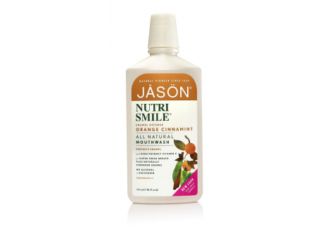 STIPRINANTIS DANTŲ EMALĮ dantų skalvimo skystis su apelsinų, cinamonų ir mėtų aliejais Jason Nutrismile, 473 g