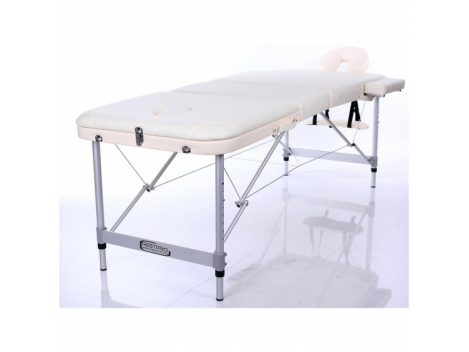 Sulankstomas masažo stalas Restpro Alu 3/Cream - sulankstomas profesionalus masažinis gultas su aliuminio rėmu ir reguliuojamo aukščio kojomis. Vienas iš lengviausių sudedamųjų stalų masažui, todėl idealiai tiks procedūras atlikinėti namų bei ofisų sąlygomis. Stalas apvilktas aukštos kokybės viniline danga, pamušalui panaudota 4 cm storio paminkštinimo medžiaga.Šis modelis išsiskiria iš kitų estetišku ir patraukliu vaizdu. Kojų aukščio reguliavimas leidžia stalą pritaikyti prie kiekvieno masažuotojo ūgio, kas leidžia masažo seanso metu pasiekti optimaliausius rezultatus. Dar didesniam patogumui stalo komplektacijoje yra vieta galvai (aliuminio pagrindas), reguliuojama pagal aukštį bei nuokrypio kampą, ir taip pat vietos rankų prilaikymui - tiek priegalvyje, tiek šonuose. Stalo suapvalinti kampai papildomai apsiūti vinilinės dangos apsaugomis. Dėka sulankstomos konstrukcijos, stalas lengvai transformuojasi į pernešimui tinkantį lagaminėlį. RESTPRO stalas skirtas ne tik atpalaidavimui nugaros, pilvo ar kojų raumenims, bet ir visoms masažo, adatų terapijos, tatuiruočių bei kosmetologinėms procedūroms.Ilgis 192 cm (su galvūgaliu - 230 cm);Plotis 70 cm (su rankų laikikliais - 95 cm);Reguliuojamas aukštis nuo 63 cm iki 84 cm;3 dalių;Maksimalus svoris 250 kg;Nuimamas galvūgalis su atvira vieta veidui ir laikikliais rankoms;Nuimami šoniniai rankų laikikliai;Apdaila - aukštos kokybės vinilinė danga;Rankinė-užklotas stalo pernešimui ir saugojimui;Sulankstyto stalo gabaritai - 98x73x19 cm;Spalva: kreminė;Svoris - 17 kg.