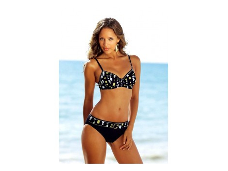Ein heißer Trendsetter im angesagten Dessin. Bedrucktes Top mit Softcups und dekorativen Raffungen. Top im Nacken zu binden. Hose mit seitlichem Label-Aufnäher....