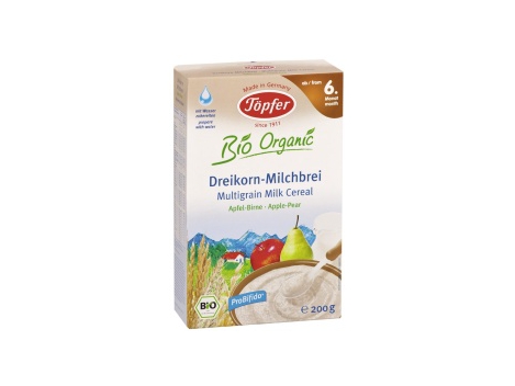 TÖPFER Daugiagrūdė pieniška košė su obuoliais ir kriaušėmis, kūdikiams nuo 6 mėn, 200 gVOKIŠKA KOKYBĖ! Kūdikiams nuo 6 mėn. Su bifido kultūromis. Su pienu ir glitimu. Be papildomo cukraus. Be aromatinių medžiagų, dažiklių ir konservantų. Produkto sudėtyje yra natūralių cukrų. Sudedamosios dalys: 33% pieno (nugriebtas pienas*, augaliniai aliejai*, iš dalies demineralizuoti išrūgų milteliai*, maltodekstrinas*, krakmolas*, nugriebto pieno milteliai*, išrūgų milteliai*, kalcio fosfatas, vitaminas C, vitaminas E, geležies (III) pirofosfatas, cinko sulfatas, niacinas, kalcio D-pantotenatas, vitaminas A, vitaminas B1, vitaminas B6, kalio jodatas, folio rūgštis, vitaminas K, vitaminas D), 22% pilno grūdo avižų miltai*, 12% pilno grūdo miežių miltai*, 12% pilno grūdo speltos miltai*, nugriebto pieno milteliai*, iš dalies demineralizuoti išrūgų milteliai*, 3% kriaušių dribsniai (kriaušės*, ryžiai*), 3% obuolių milteliai*, kalcio karbonatas, natūralus obuolių aromatas, bifido bakterijų kultūros (B. breve, B. bifidum, B. infantis, B. longum), vitaminas B1, vitaminas A, vitaminas D.*-iš ekologinių ūkių.Maistinė vertė (100 g) 1759 kJ/417 kcal: baltymų 13.7 g, angliavandenių 65.5 g (iš jų laktozės 23 g, gliukozės 0.7 g, fruktozės 2 g, sacharozės 1.2 g, krakmolo 33 g, maltodekstrino 3.9 g), riebalų 10 g (iš jų sočiųjų 3.2g, mononesočiųjų 4g, polinesočiųjų 2.8g), skaidulų 4.2g, natrio 0.121g.Paruošimas: užvirinti 140 ml vandens, atvėsinti iki 50°C ir supilti į dubenėlį. Įdėti 5 v. š. (40 g) košės miltelių ir gerai išmaišyti. Palikti 1 minutei pastovėti, kol pasidarys reikiamos konsistencijos. Paruoštos košės nešildyti mikrobangų krosnelėje.Visus produktus skirtus jaunesniems kaip 6 mėn. kūdikiams galima vartoti tik pediatrui rekomendavus.Laikyti sandarioje talpoje, vėsioje, sausoje ir švarioje vietoje. Sunaudoti per 2-3 savaites.Vokietijoje pagamintas ir sertifikuotas ekologiškas produktas. Töpfer gamykla yra įsikūrusi Pietų Vokietijoje, Alpių regione. Į pieniškas košes dedami pieno milteliai yra gaminami iš ekologinių ūkių Alpių karvių pieno. Karvės pieno baltymai ir riebalai pakeičiami taip, kad labiausiai atitiktų motinos pieno sudėtį. Pienas praturtinamas vitaminais, mineralais ir mikroelementais, reikalingais atitinkamo amžiaus kūdikiui (kaip nurodo ES direktyva 2006/141/EU).Töpfer turi beveik šimto metų patirtį kūdikių maisto gamyboje - įmonė įkurta 1911 m. Nuo 1989 m. gamina ekologišką ES sertifikuotą maistą kūdikiams.Kompanija turi savo laboratoriją ir, kurdama savo produkcijos receptus, bendradarbiauja su mokslo bei medicinos įstaigomis.Visos Töpfer peniškos košės gaminamos su natūraliai kūdikių žarnynui būdingomis gerosiomis žarnyno bakterijomis: Töpfer patentuotu bifido kultūrų mišiniu Probifido®.