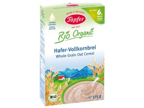 "TÖPFER" ekologiška pilno grūdo avižų košė, kūdikiams nuo 6 mėn., neto masė 175g VOKIŠKA KOKYBĖ!  Kūdikiams nuo 6 mėnesių be pieno. Su glitimu. Be papildomo cukraus, aromatinių medžiagų, dažiklių ir konservantų. Produkto sudėtyje yra natūralių cukrų. Labai labai paprastai paruošiama, sveika ir skani košė mažiesiems. Kol neparagauja su uogiene, šveičia ir be jos, todėl jei uogienės turite mažai, geriau net nesiūlykit. Sudedamosios dalys: pilno grūdo avižų miltai*, vitaminas B1. *-iš ekologinių ūkių.Maistinė vertė (100 g) - 1688kJ/400 kcal: baltymų 13 g, angliavandenių 66.1 g (iš jų krakmolo 65.6, cukrų 0.6 g), riebalų 7.7 g (iš jų sočiųjų 1.5 g, mononesočiųjų 2.9 g. polinesočiųjų 3.3 g), skaidulų 8.7 g, natrio 0.011 g, vitaminas B1 1.3 mg. Paruošimas: užvirinti 100 ml pieno ir 100 ml vandens, atvėsinti iki iki 50°C ir supilti į dubenėlį. Įdėti 5 v.š. (25 g) košės miltelių ir gerai išmaišyti. Palikti 1 minutei pastovėti, kol pasidarys reikiamos konsistencijos. Galima ruošti su vaisiais: 2 v.š. košės miltelių išmaišyti 70 ml šviežiai užvirinto ir atvėsinto iki 50 °C vandens, pridėti 100 g (6-7 v.š.) konservuotų vaisių arba vaisių tyrelės (pvz., obuolių, kriaušių, bananų).Paruoštos košės nešildyti mikrobangų krosnelėje.Laikyti sandarioje talpoje, vėsioje, sausoje ir švarioje vietoje. Sunaudoti per 3-4 savaites.Vokietijoje pagamintas ir sertifikuotas ekologiškas produktas. Töpfer turi beveik šimto metų patirtį kūdikių maisto gamyboje - įmonė įkurta 1911 m. Nuo 1989 m. gamina ekologišką ES sertifikuotą maistą kūdikiams.Kompanija turi savo laboratoriją ir, kurdama savo produkcijos receptus, bendradarbiauja su mokslo bei medicinos įstaigomis.
