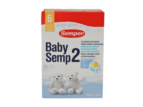 TOLESNIO MAITINIMO pieno mišinys BabySemp2, kūdikiams nuo 6 mėn., 350 g Tik vyresniems kaip 6 mėn. amžiaus kūdikiams! Baby Semp 2 - tolesnio maitinimo pieno mišinys specialiai skirtas vartoti tik vyresniems kaip 6 mėn. amžiaus kūdikiams. Grynasis kiekis: 350 g.Svarbi pastaba: Motinos pienas yra geriausias maistas kūdikiui. Jis aprūpina visomis būtiniausiomis medžiagomis. Pradėti kūdikių iki 6 mėnesių papildomą maitinimą, įskaitant visas išimtis, reikėtų tik tuo atveju, jei, remdamiesi specialiais atskiro vaiko augimo ir vystymosi poreikiais, taip pataria nepriklausomi medicinos, mitybos specialistai ar farmacininkai arba kiti už motinos ir kūdikio priežiūrą atsakingi specialistai. Sudedamosios dalys: nugriebtas pienas, laktozė, maltodekstrinas, grietinėlė, išrūgų baltymai (iš pieno), saulėgrąžų aliejus, galaktooligosacharidai (GOS; iš laktozės), rapsų aliejus, palmių aliejus, mineralinės medžiagos (natris, kalis, chloridas, kalcis, fosforas, geležis, magnis, cinkas, jodas, varis, manganas, selenas), kokosų aliejus, emulsiklis (sojos lecitinas), vitaminai (A, D, E, K, C, tiaminas, riboflavinas, niacinas, B6, folio rūgštis, biotinas, pantoteno rūgštis), cholinas, žuvų taukai, augalinis aliejus (vienaląsčiai organizmai), taurinas, inozitolis, L-karnitinas.