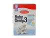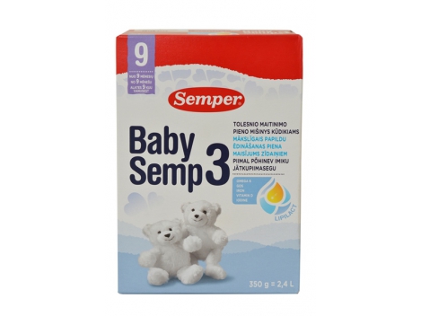 TOLESNIO MAITINIMO pieno mišinys BabySemp3, kūdikiams nuo 9 mėn., 350 g Kūdikiams nuo 9 mėnesių! Motinos pienas yra geriausias maistas kūdikiui. Jis aprūpina visomis būtiniausiomis medžiagomis. Maitinimas iš buteliuko gali sumažinti kūdikio norą žįsti krūtį. Prieš pradėdami vartoti pieno mišinį, pasitarkite su gydytoju.BabySemp 3 yra pieno mišinys, vartotinas tik kaip vis įvairėjančio kūdikio maisto papildas ir tinka tik vaikams, vyresniems nei 6 mėnesiai. Rekomenduojama duoti vaikams nuo 9 mėnesių amžiaus. BabySemp 3 nevartotinas kaip motinos pieno papildas pirmuosius 6 mėnesius. Sudedamosios dalys: nugriebtas pienas, laktozė, maltodekstrinas, grietinėlė, išrūgų baltymai (iš pieno), galaktooligosacharidai (GOS; iš laktozės), saulėgrąžų aliejus, rapsų aliejus, palmių aliejus, kokosų aliejus, mineralinės medžiagos (kalis, kalcis, natris, chloridas, fosforas, magnis, geležis, cinkas, varis, manganas, jodas, selenas), emulsiklis (sojos lecitinas), vitaminai (A, D, E, K, C, tiaminas, riboflavinas, niacinas, B6, folio rūgštis, B12, biotinas, pantoteno rūgštis), žuvų taukai, cholinas, augalinis aliejus (vienaląsčiai organizmai), taurinas, inozitolis, L-karnitinas.